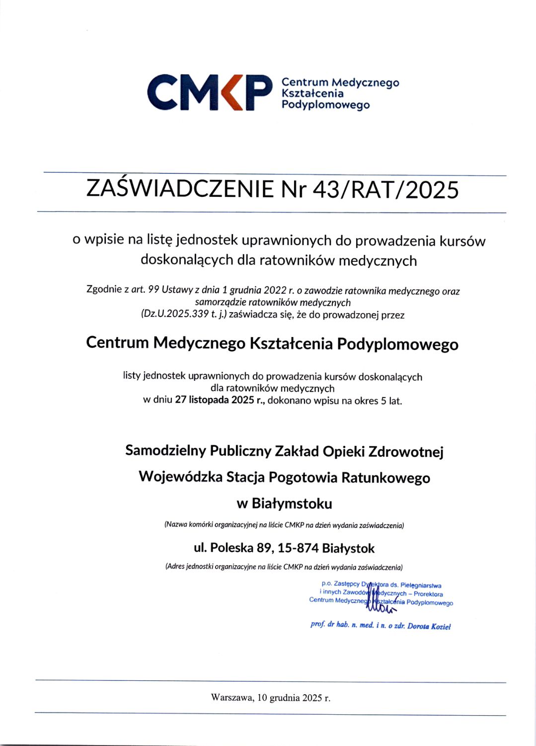 23 marca 2026 roku Pani Dyrektor Izabela Kolecka oraz Pani Kierownik Walentyna Dziemiańczuk odebrały, podczas uroczystej Gali w Warszawie, prestiżową nagrodę Gazele Biznesu 2025, przyznaną Samodzielnemu Publicznemu Zakładowi Opieki Zdrowotnej Wojewódzkiej Stacji Pogotowia Ratunkowego w Białymstoku. Jest to ogólnopolski ranking, który wyróżnia najlepiej rozwijające się instytucje i firmy w kraju. Ranking Gazele Biznesu jest przygotowywany przez dziennik Puls Biznesu we współpracy z wywiadownią gospodarczą Coface, która weryfikuje wyniki finansowe firm. Nagroda jest efektem zaangażowania i oddanej pracy całego zespołu pogotowia. Będziemy kontynuować naszą drogę ku pozytywnym zmianom i rozwojowi w sektorze ochrony zdrowia w województwie podlaskim, tym samym, w całym systemie Państwowego Ratownictwa Medycznego. Każdego dnia pokazujemy, że profesjonalizm, zaangażowanie i serce do pracy mają ogromne znaczenie. Razem tworzymy coś naprawdę wyjątkowego.