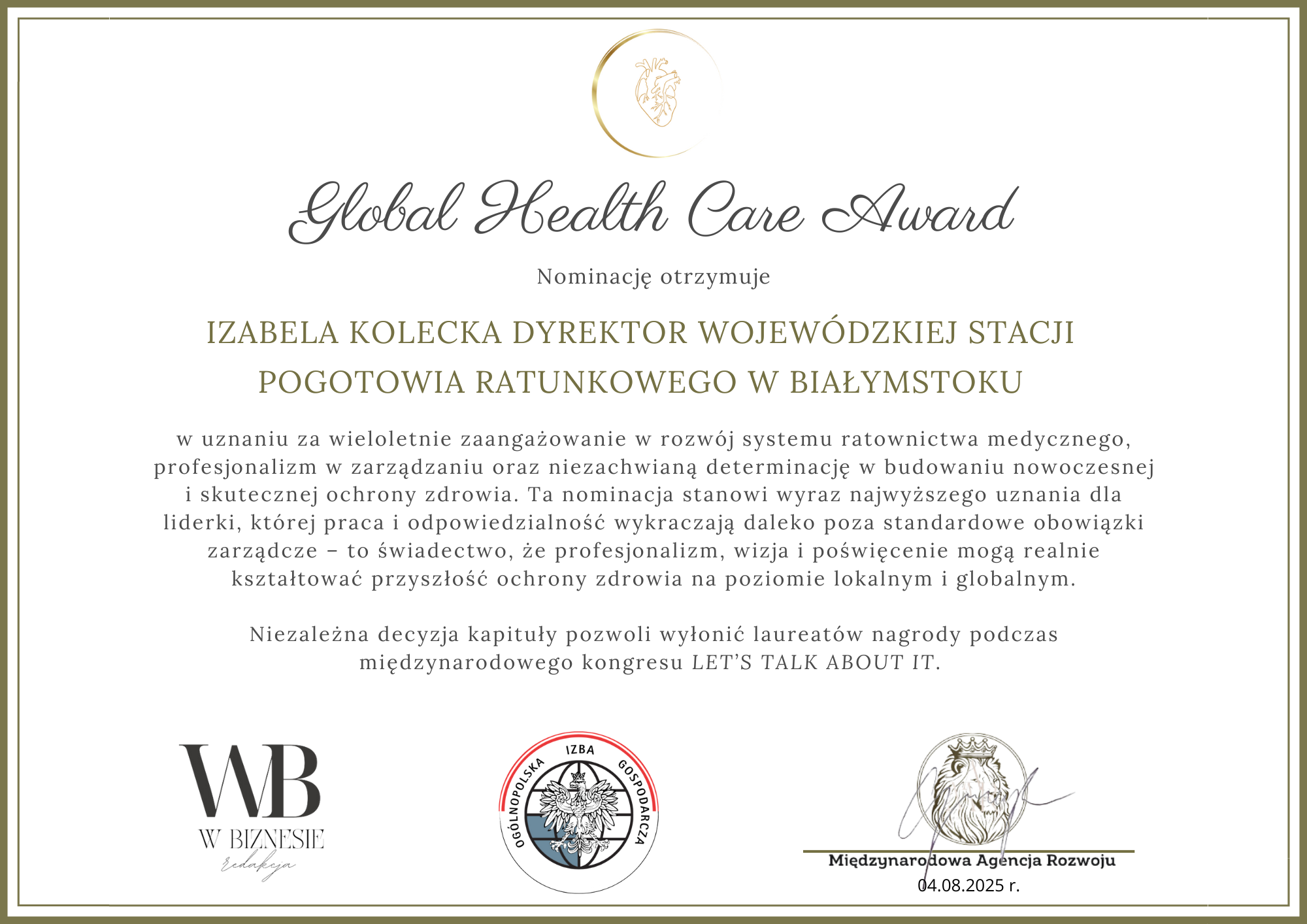 Pani Dyrektor Izabela Kolecka otrzymała nominację do nagrody Global Health Care Award za wieloletnie zaangażowanie w rozwój systemu ratownictwa medycznego. Wyróżnienie jest pięknym potwierdzeniem, że praca z pasją naprawdę ma znaczenie, a człowiek jest najważniejszy.