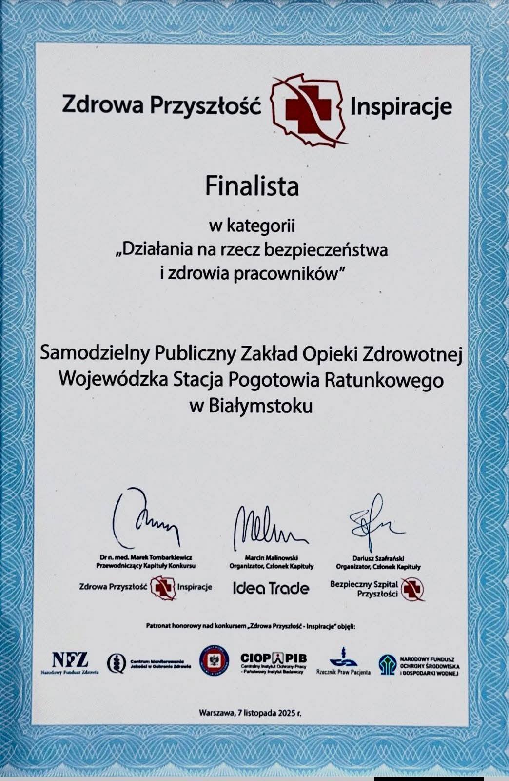 7 listopada Zastępca Dyrektora ds. Medycznych dr n. med. Pan Mirosław Rybałtowski, w imieniu Pani Dyrektor Izabeli Koleckiej uczestniczył w uroczystej gali 8. edycji Konkursu „Zdrowa Przyszłość – Inspiracje 2025", inicjatywy, która od lat wspiera rozwój nowoczesnych rozwiązań w polskiej ochronie zdrowia. SP ZOZ WSPR w Białymstoku zostało Finalistą tego konkursu. Patronat Honorowy objęli Narodowy Fundusz Zdrowia, Główny Inspektor Sanitarny, Centrum Monitorowania Jakości w Ochronie Zdrowia oraz Centralny Instytut Ochrony Pracy.