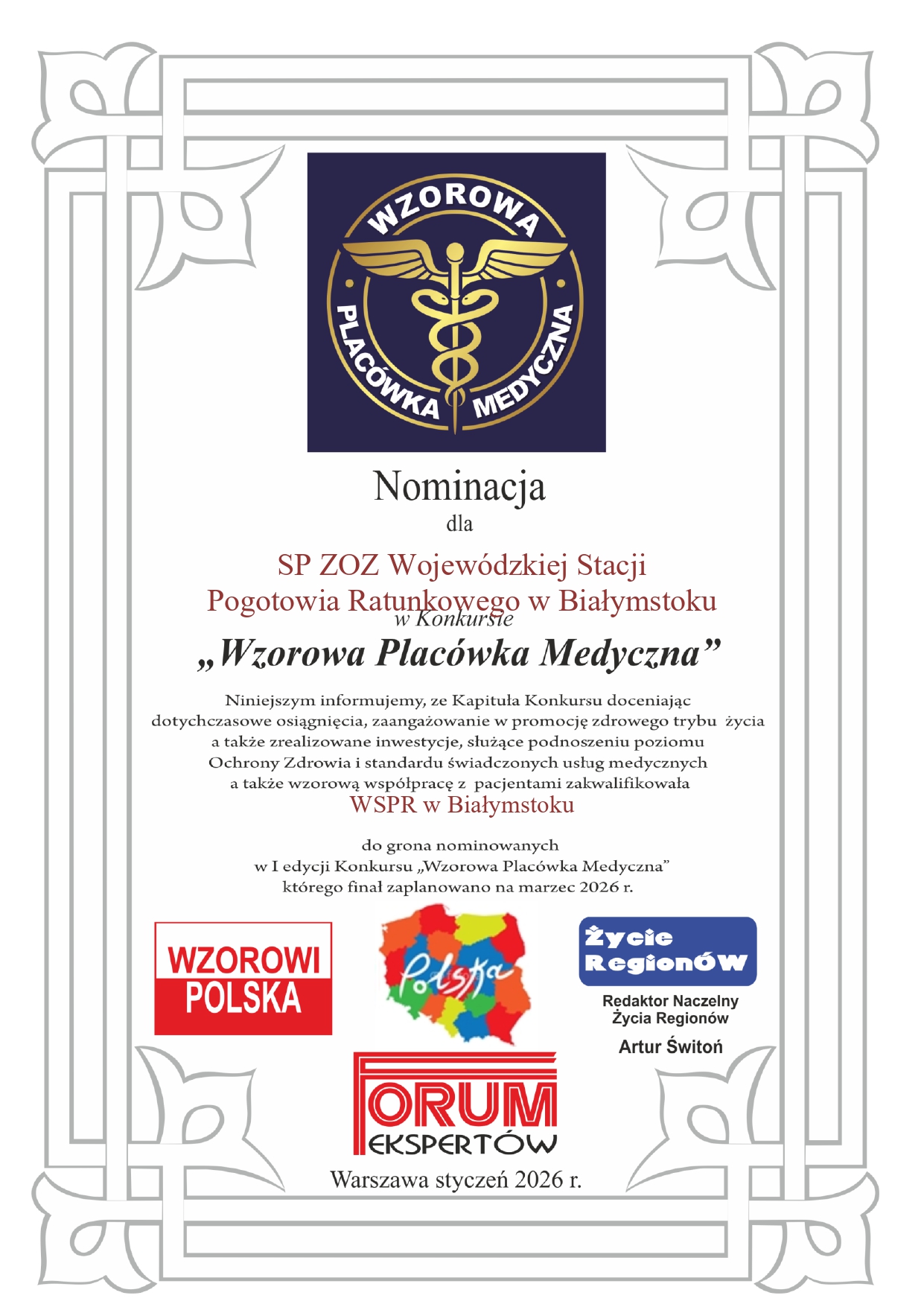 Samodzielny Zakład Opieki Zdrowotnej Wojewódzka Stacja Pogotowia Ratunkowego w Białymstoku została nominowana w 1. edycji konkursu "Wzorowa Placówka Medyczna" . To wielkie wyróżnienie i dowód na to, że codzienna praca naszych zespołów ratownictwa medycznego ma realne znaczenie. Każdy wyjazd, każda pomoc i każda minuta walki o zdrowie i życie pacjentów składa się na coś naprawdę ważnego!.