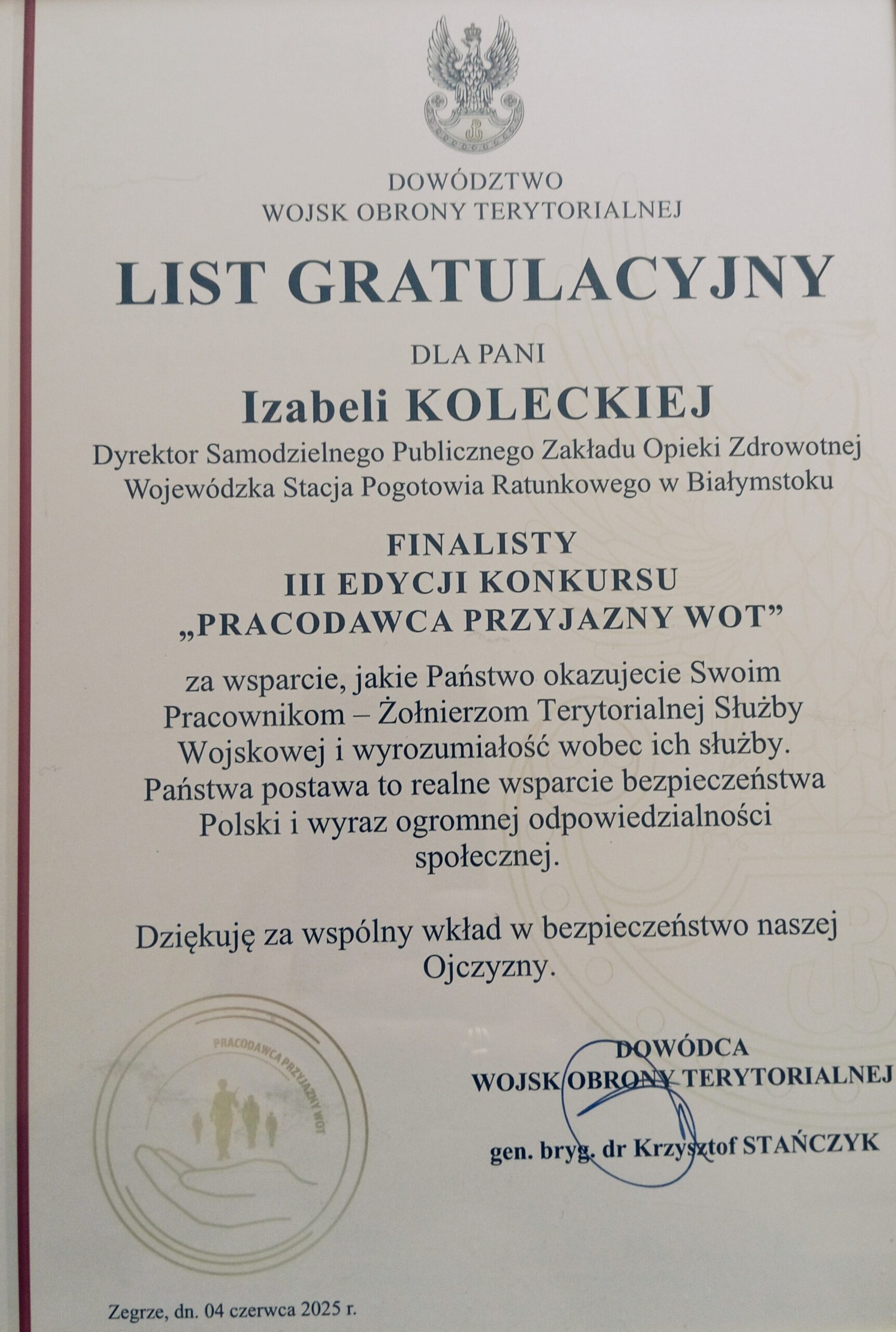 Pani Dyrektor Izabela Kolecka odebrała List gratulacyjny Finalisty III. edycji konkursu „Pracodawca przyjazny WOT”. Dowódca Wojsk Obrony Terytorialnej gen. bryg. dr Krzysztof Stańczyk podziękował Dyrekcji SP ZOZ WSPR w Białymstoku, za wspieranie pracowników pogotowia – żołnierzy Terytorialnej Służby Wojskowej. Nieustannie czujemy dumę, że są wśród nas ludzie odpowiedzialni za bezpieczeństwo naszej Ojczyzny.